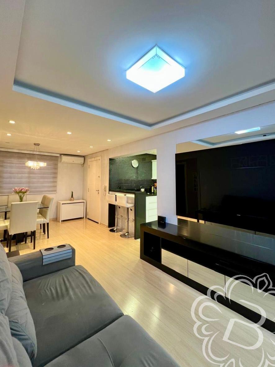 Conta com 84m² privativos, living integrando sala de estar/jantar e cozinha, banheiro social e sacada gourmet. São dois dormitórios sendo um suíte e 2 vagas de garagem.